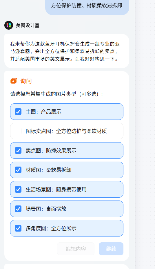 首先测试美图设计室生成商品套图。我使用了【一键生成亚马逊套图】模板,需要根据上传产品微调提示词,例如说明产品类型、销售国家和卖点。发送指令后可以看到AI的思考过程,并可选择生成图片类型或编辑提示词,生成结果较为可控。