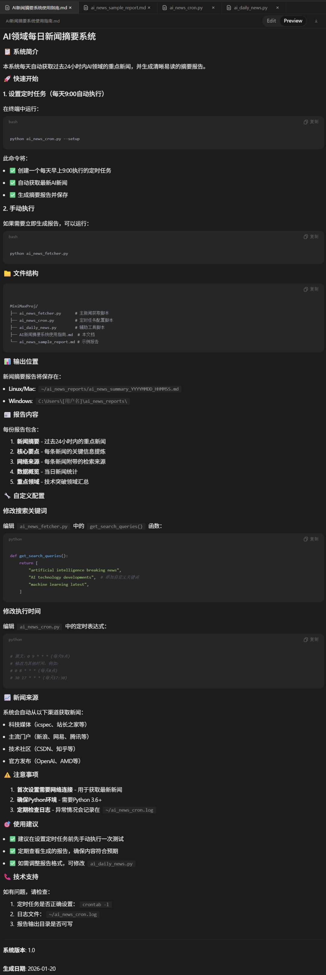每天 9:00 为我提供过去 24 小时内 AI 领域的重点新闻摘要。每条新闻提炼一个核心要点,并附带网络检索来源,确保清晰易读