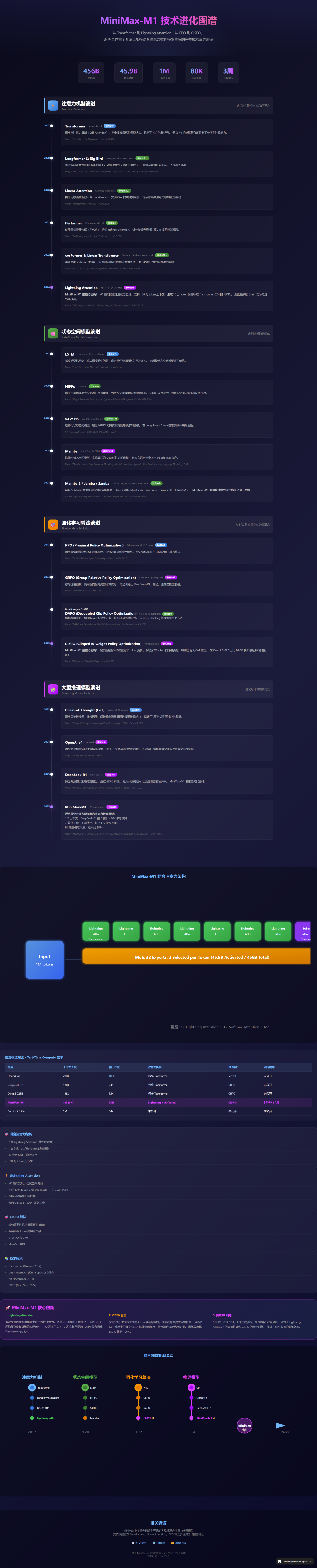这是 MiniMax-M1 的技术报告 https://arxiv.org/pdf/2506.13585,研究其参考文献,了解其背后的技术,然后制作一个网页,展示 MiniMax-M1 背后的技术进化图谱,务必尽量往前追溯。