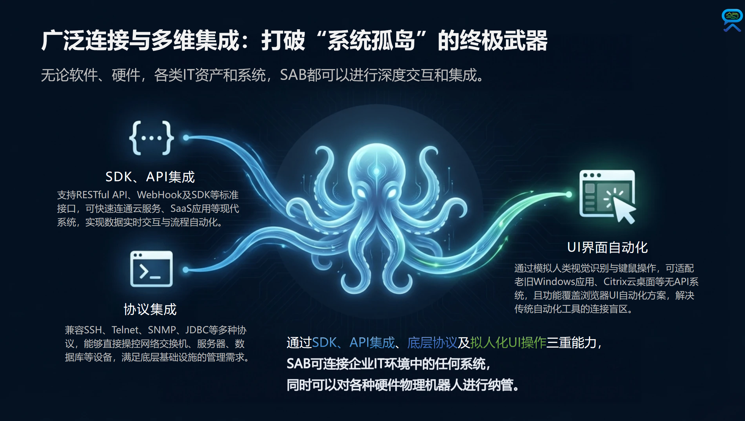 - 分布式灵活部署:SAB机器人可分布式部署在不同分支机构或网络区域,实现本地化、并行化巡检。单次任务可并发扫描数百台设备,将前述200台设备的巡检时间从2小时缩短至5分钟,效率提升高达24倍。