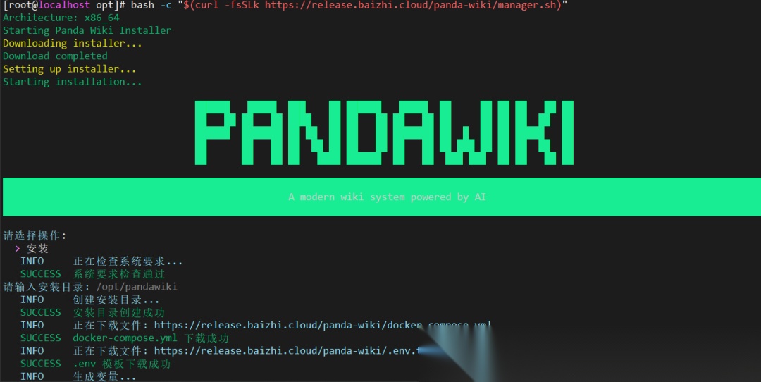 使用 root 权限登录服务器,执行以下命令安装PandaWiki。