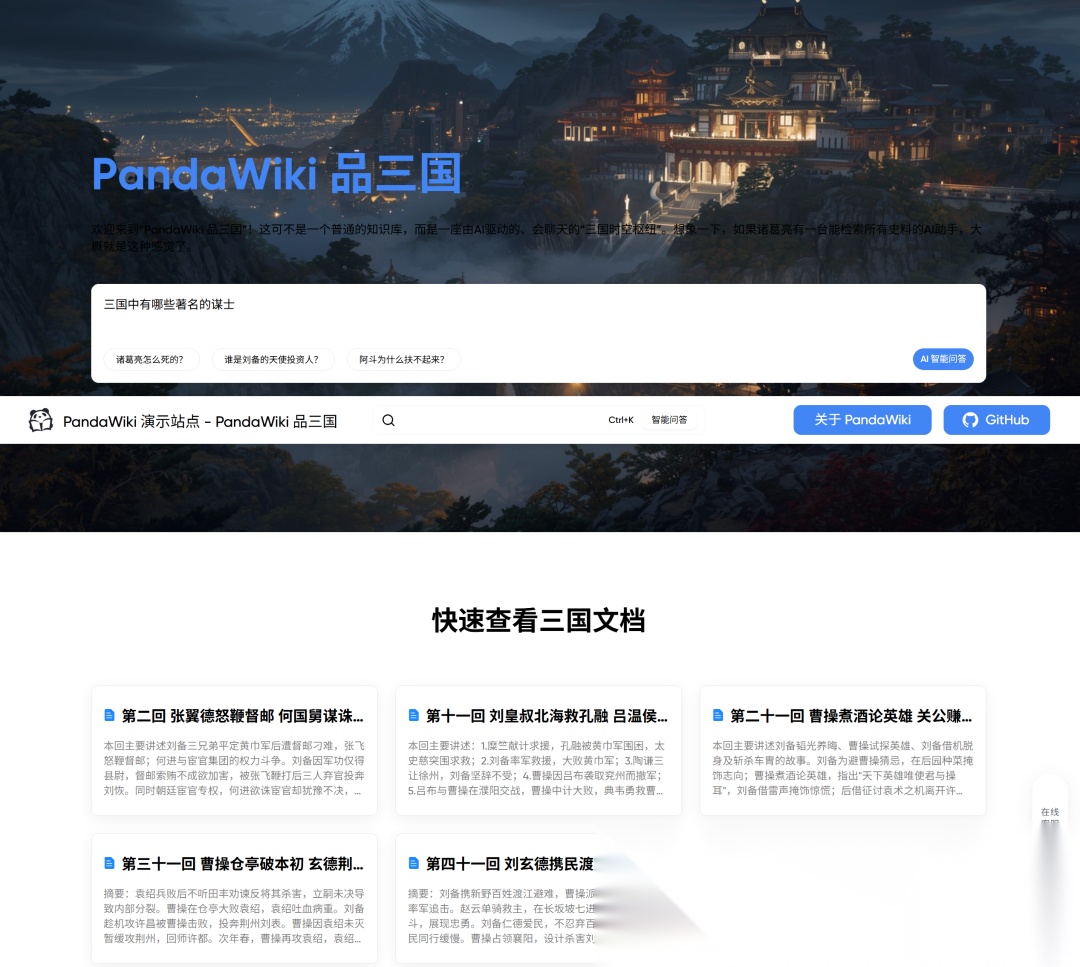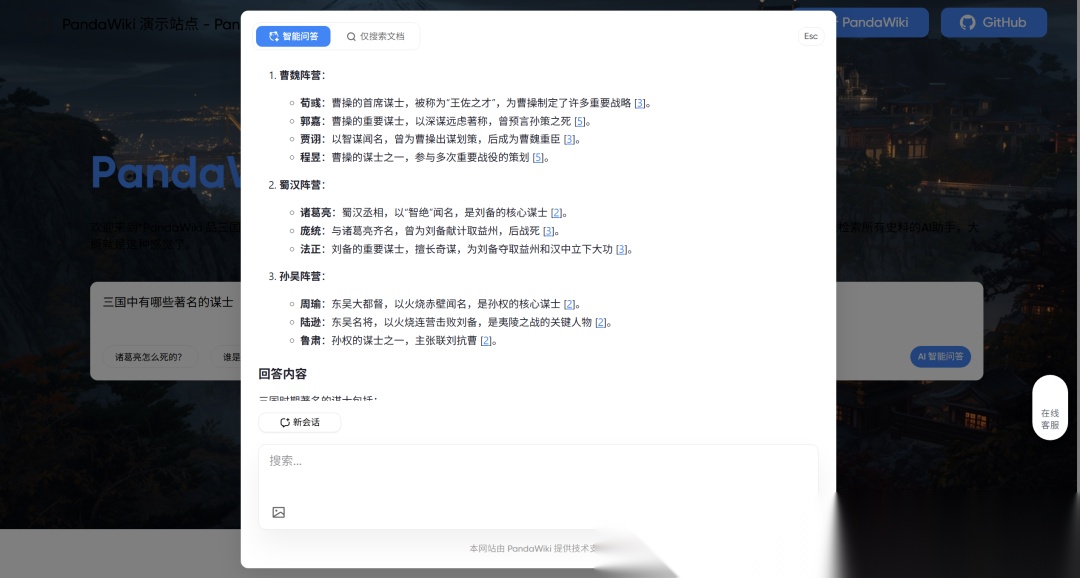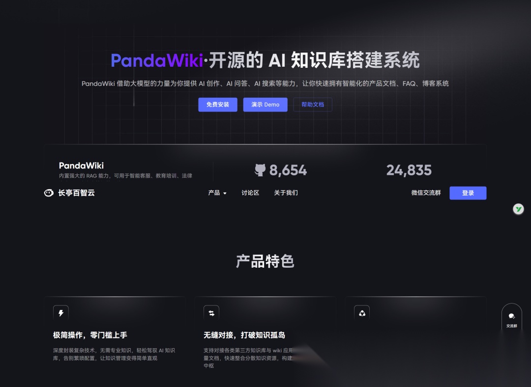 PandaWiki 是一款由 AI 大模型驱动的开源知识库搭建系统,凭借强大的功能和极低的上手门槛,帮助你快速构建智能化的 产品文档、技术文档、FAQ、博客系统,借助大模型的力量为你提供 AI 创作、AI 问答、AI 搜索 等能力。上线后累计装机量突破 3w+,成为开发者和企业争相追捧的热门项目。