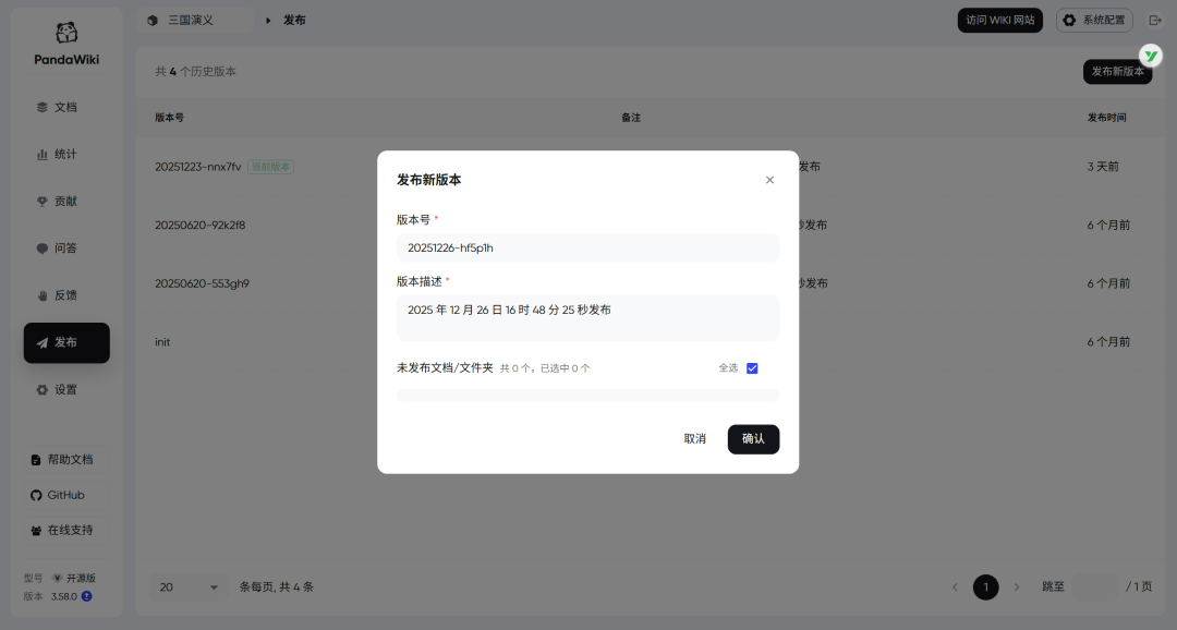 点击“发布”。发布之后,PandaWiki内置的AI立刻就会这些文档进行梳理并学习。