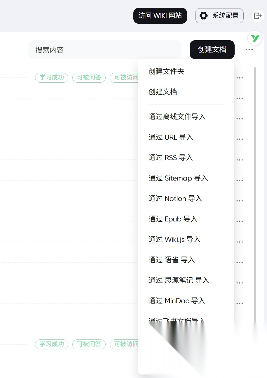 PandaWiki除了能手动创文档外,支持本地文件导入,URL导入、语雀、飞书文档、钉钉文档等十几种。