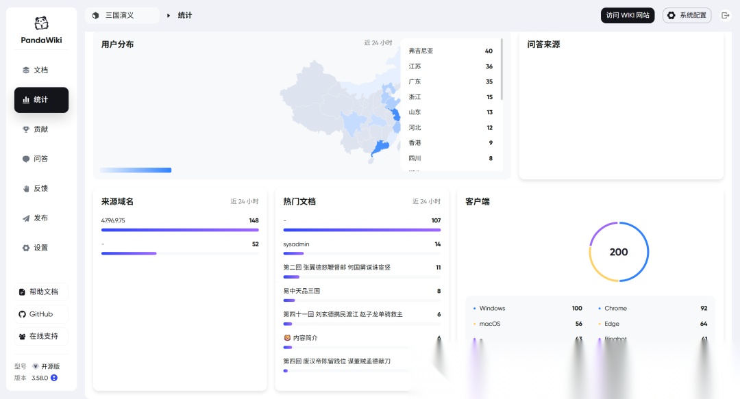 内嵌数据统计,包括实时来访、用户分布、问答来源、来源域名等,方便你随时随地分析知识使用情况。
