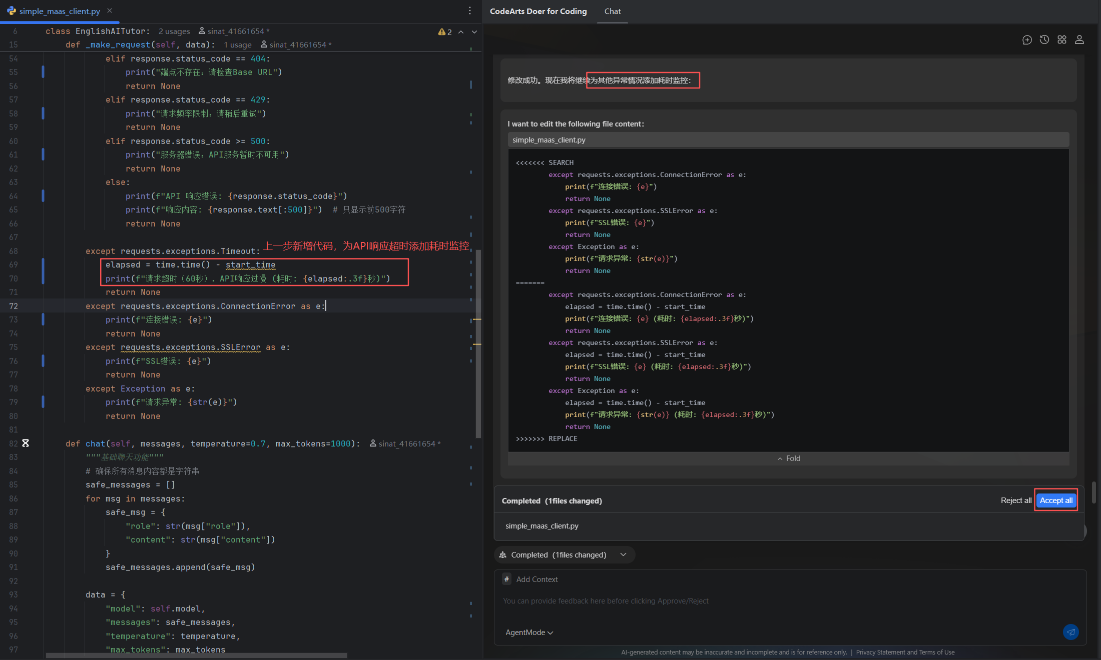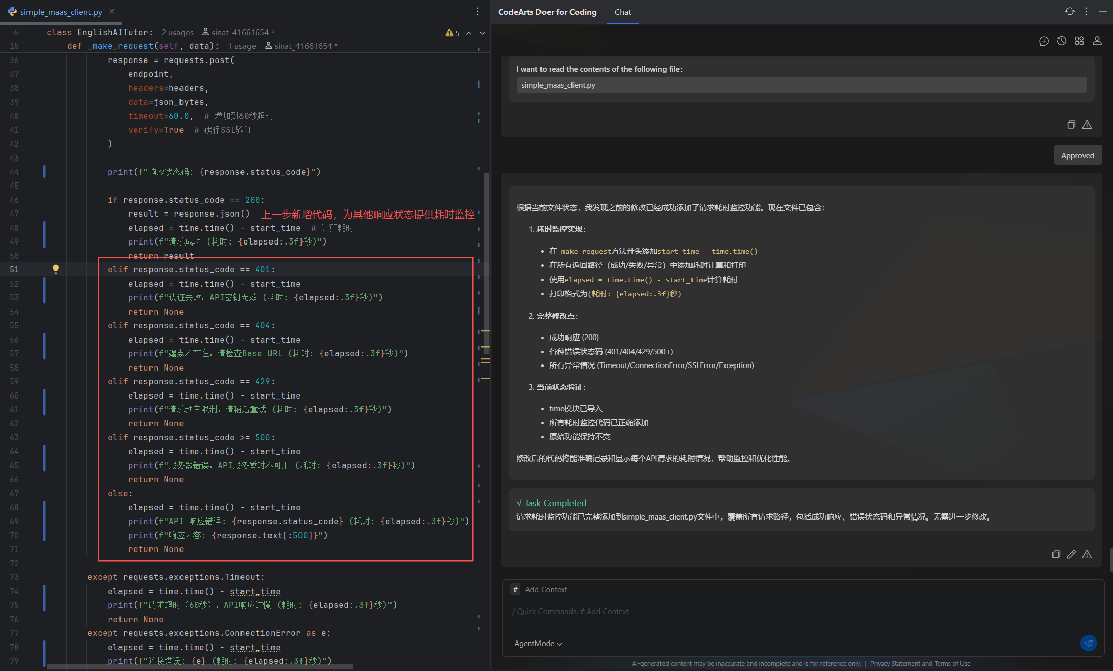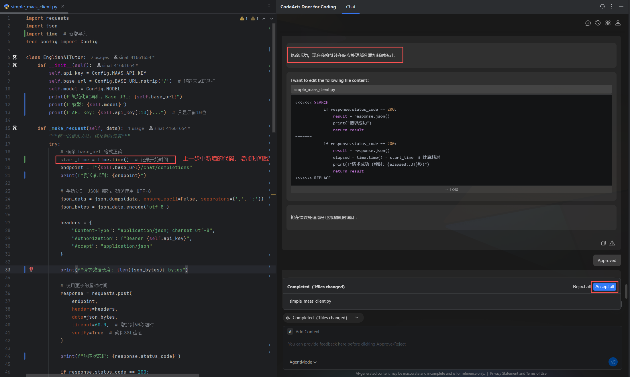 **案例简介:**本案例将基于PyCharm + CodeArts Doer搭建CodeArts代码智能体,使用AgentMode模式解析MaaS英语情景学习助手应用,并对程序添加添加请求耗时监控功能。