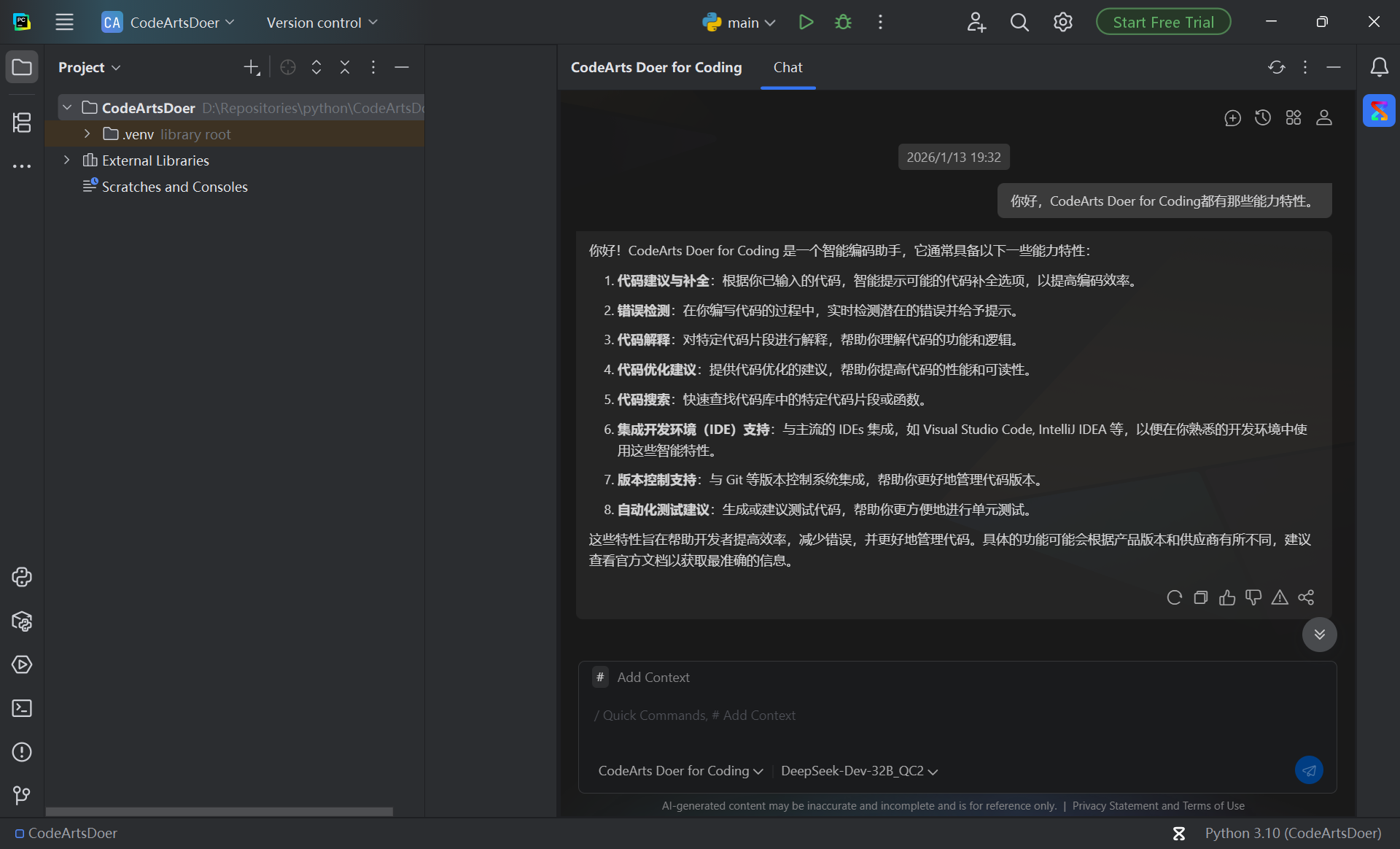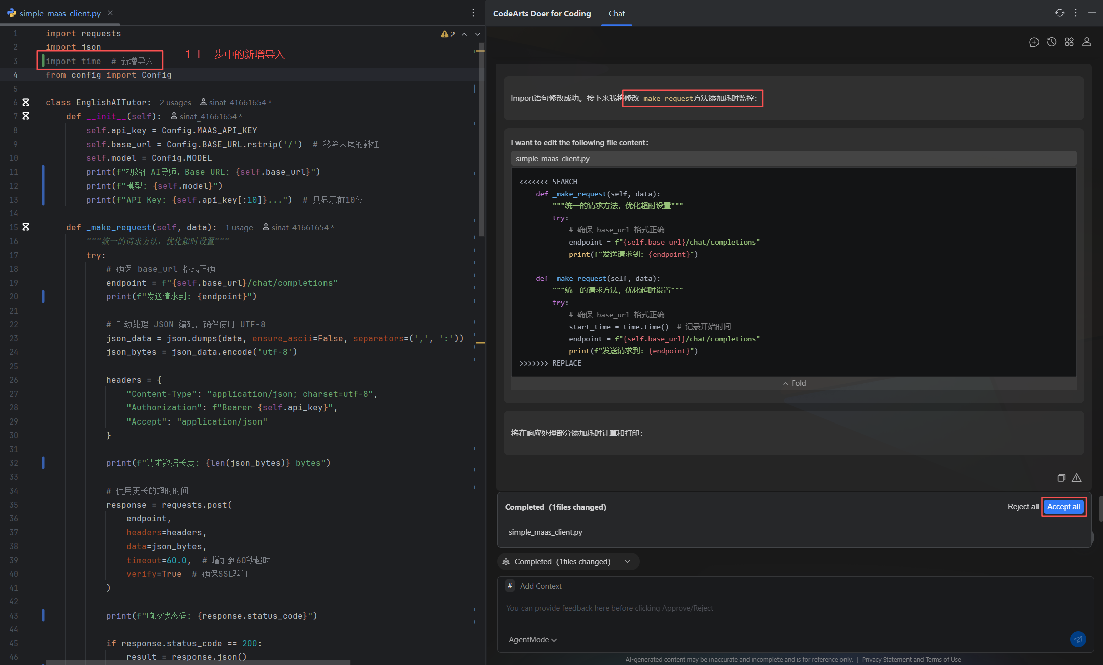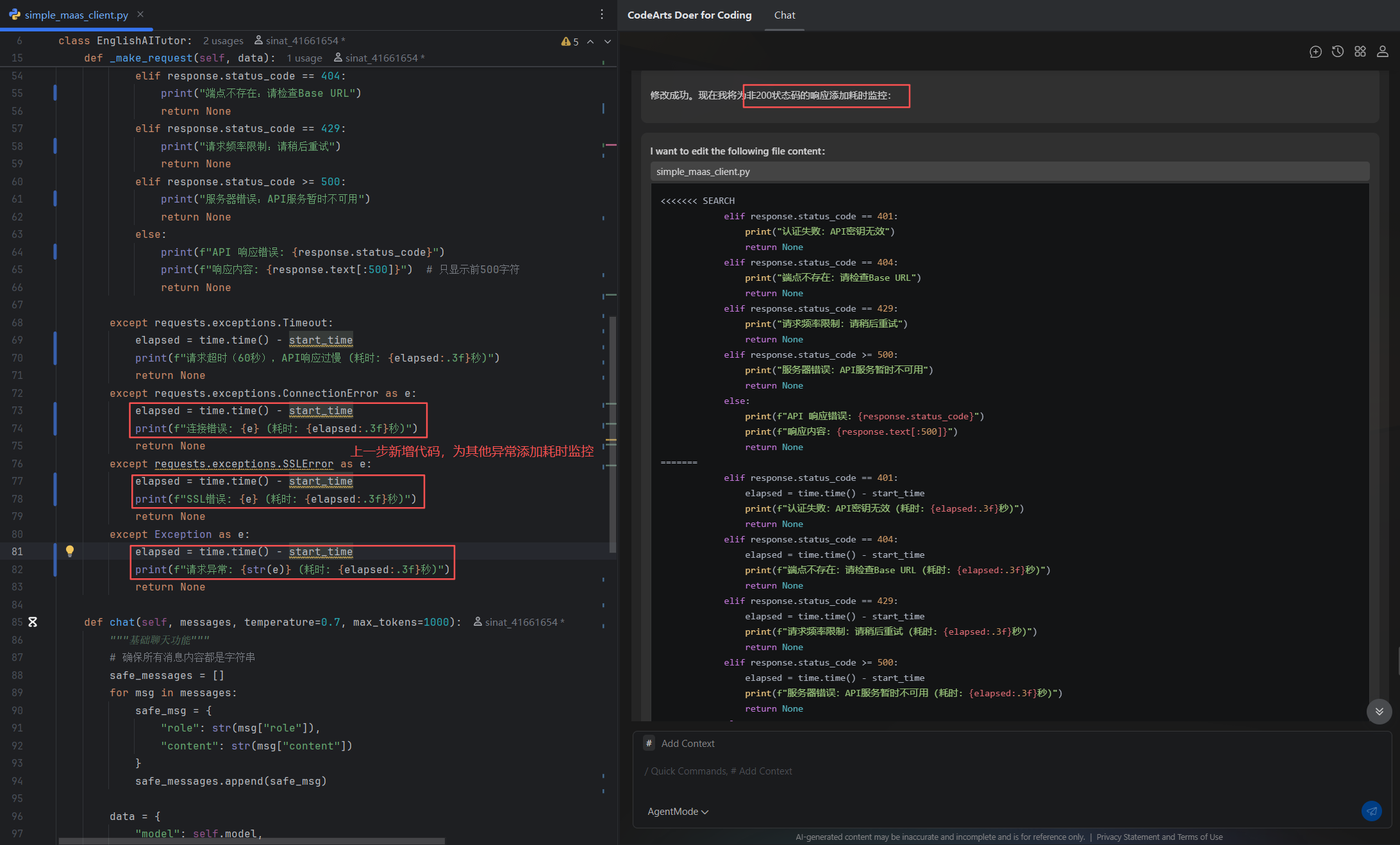 本案例将基于PyCharm + CodeArts Doer搭建CodeArts代码智能体,使用AgentMode模式解析MaaS英语情景学习助手应用,并对程序添加添加请求耗时监控功能。