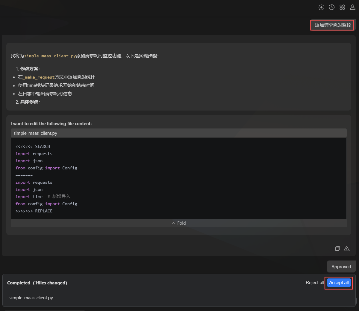 现在,对程序增加耗时监控功能,向Agent请求:“添加请求耗时监控”。Agent自行制定修改方案和实行步骤: