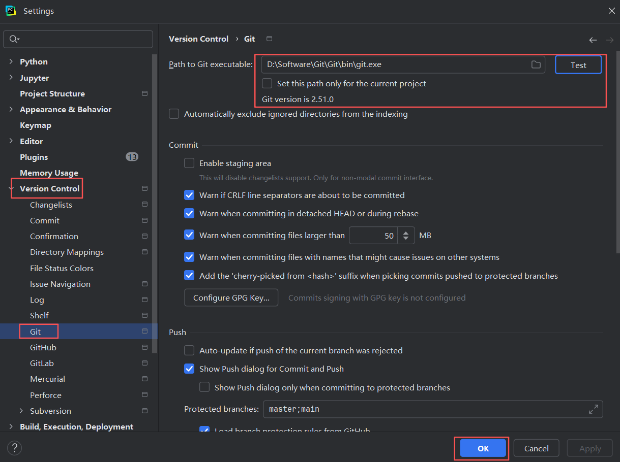 在PyCharm左上角打开File > Settings,左侧选择Version Control > Git,右侧Path to Git executable配置Git安装目录,然后点Test,提示Git版本即为配置成功,然后点OK。