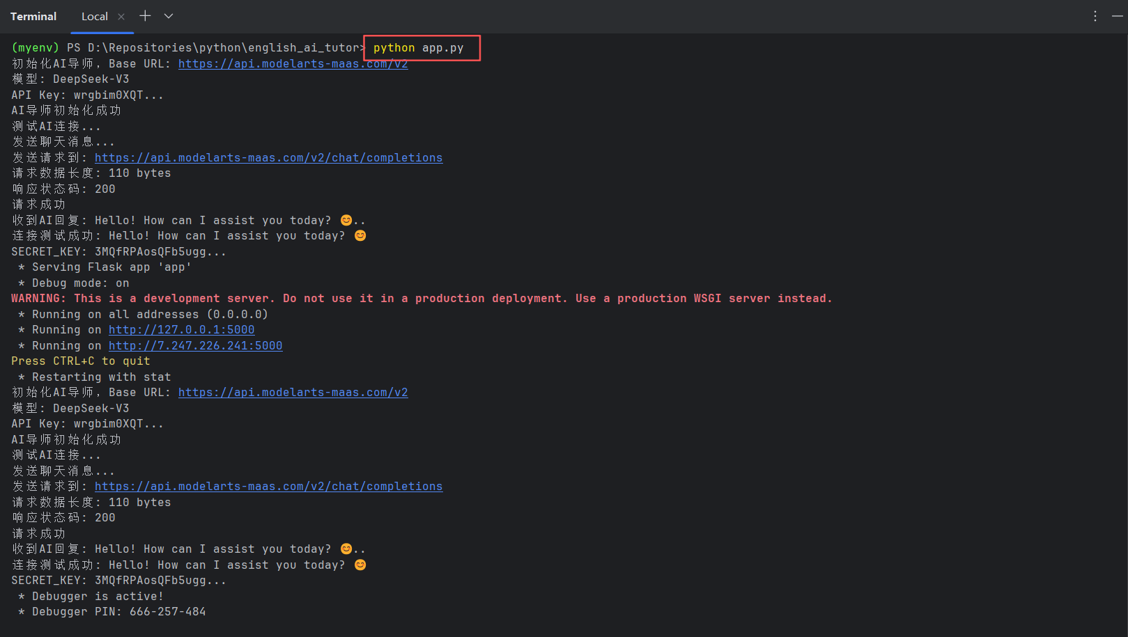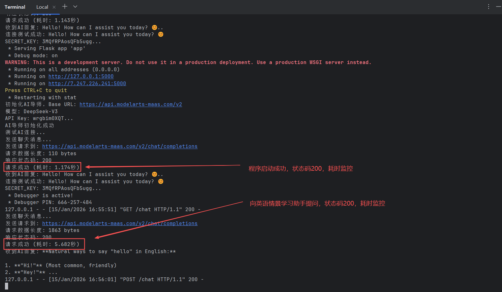 查看后台日志,成功输出状态码200,程序启动成功以及向MaaS英语情景学习助手提问的耗时情况。