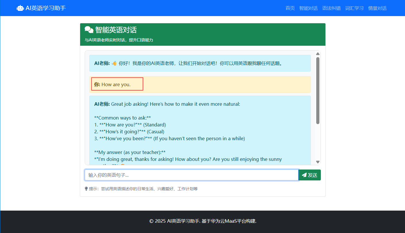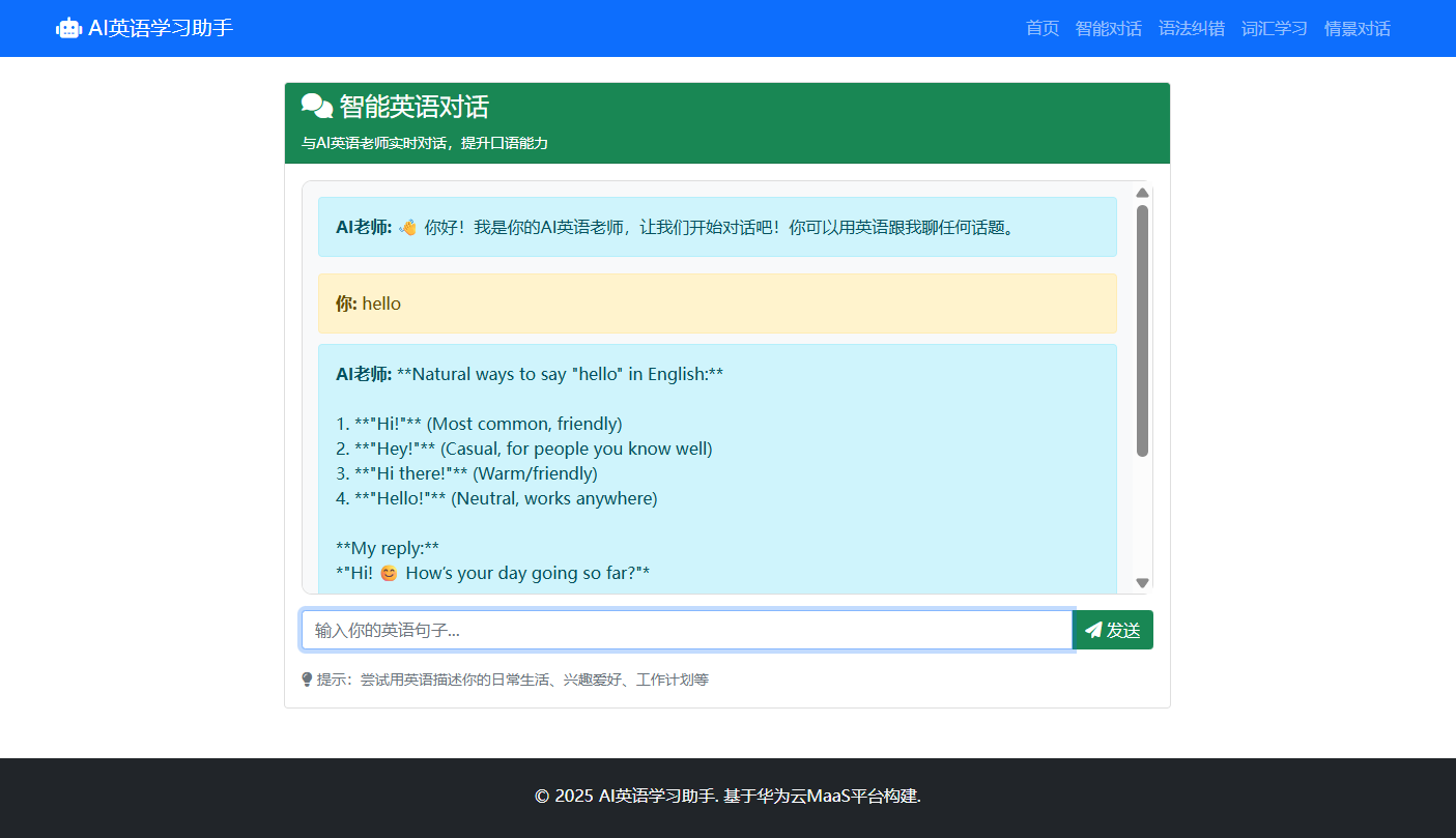 MaaS英语情景学习助手应用引自案例:《基于华为开发者空间-云开发环境(容器)+MaaS实现英语情景学习助手》