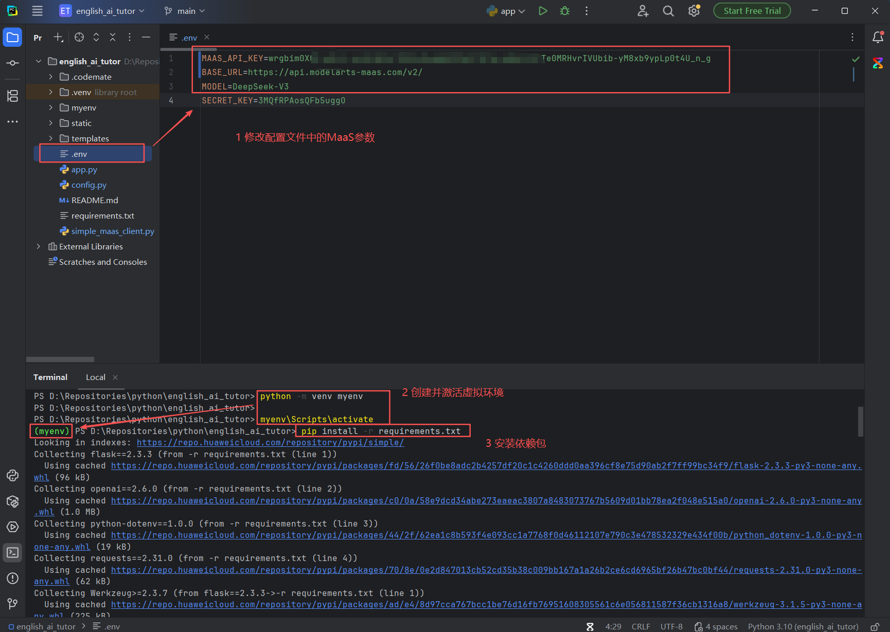 MaaS英语情景学习助手工程环境自动加载完成后,打开.env文件,修改配置参数: