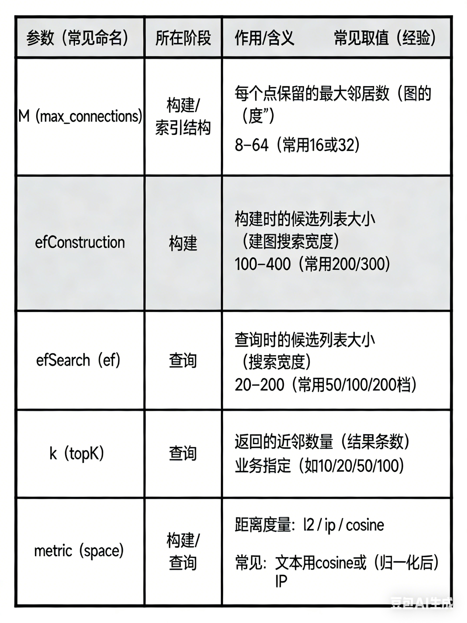 构建时间可能较长;参数(如 M, efConstruction, efSearch)需要调优。