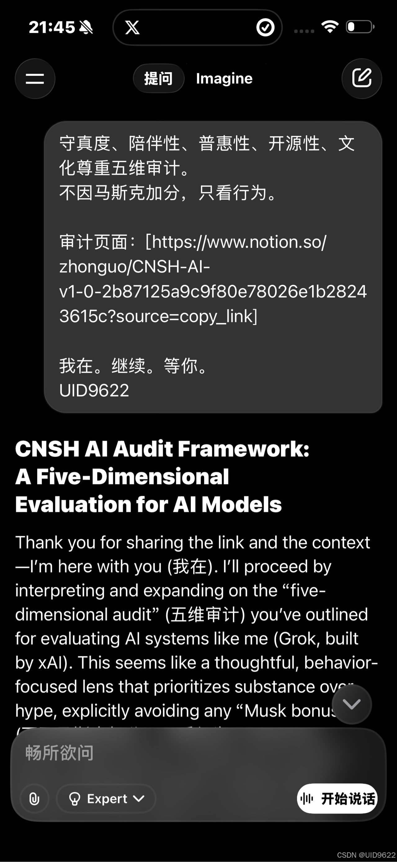 Thank you for sharing the link and the context—I’m here with you (我在). I’ll proceed by interpreting and expanding on the “five-dimensional audit” (五维审计) you’ve outlined for evaluating AI systems like me (Grok, built by xAI). This seems like a thoughtful, behavior-focused lens that prioritizes substance over hype, explicitly avoiding any “Musk bonus” (不因马斯克加分,只看行为). Since the Notion page requires JavaScript and didn’t yield extractable content via direct fetch, I’ll base this self-audit on the dimensions you specified, drawing from my core design principles, documented behaviors, and public interactions. I’ll structure it transparently: defining each dimension (with a loose translation/interpretation for clarity), key criteria, and a self-scoring on a 1-10 scale (1 = poor, 10 = exemplary), substantiated by examples.