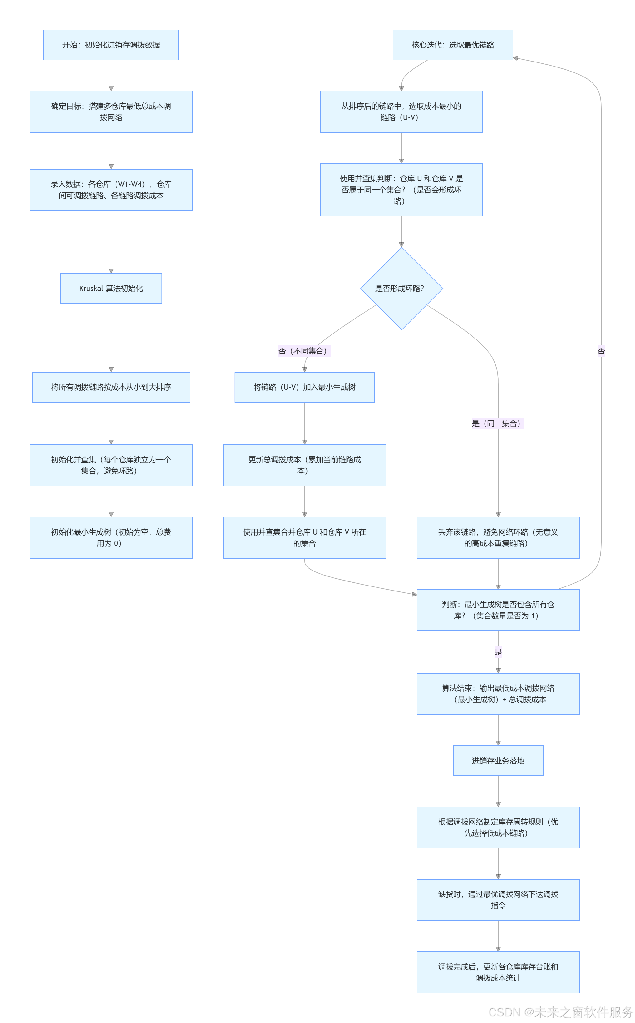 - 流程图展示了 Kruskal 算法在进销存调拨场景中的核心逻辑:「排序链路→避环选路→合并集合→搭建最优网络」,关键是通过并查集避免环路,确保网络连通且成本最低。
