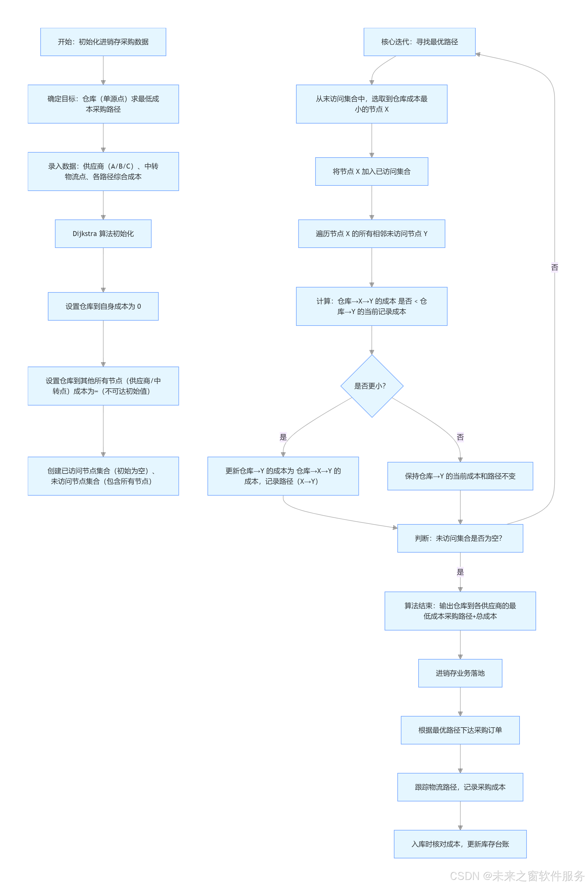 - 流程图清晰展示了 Dijkstra 算法在进销存采购场景中的「业务初始化→算法执行→业务落地」全流程,核心是迭代更新最低成本路径。