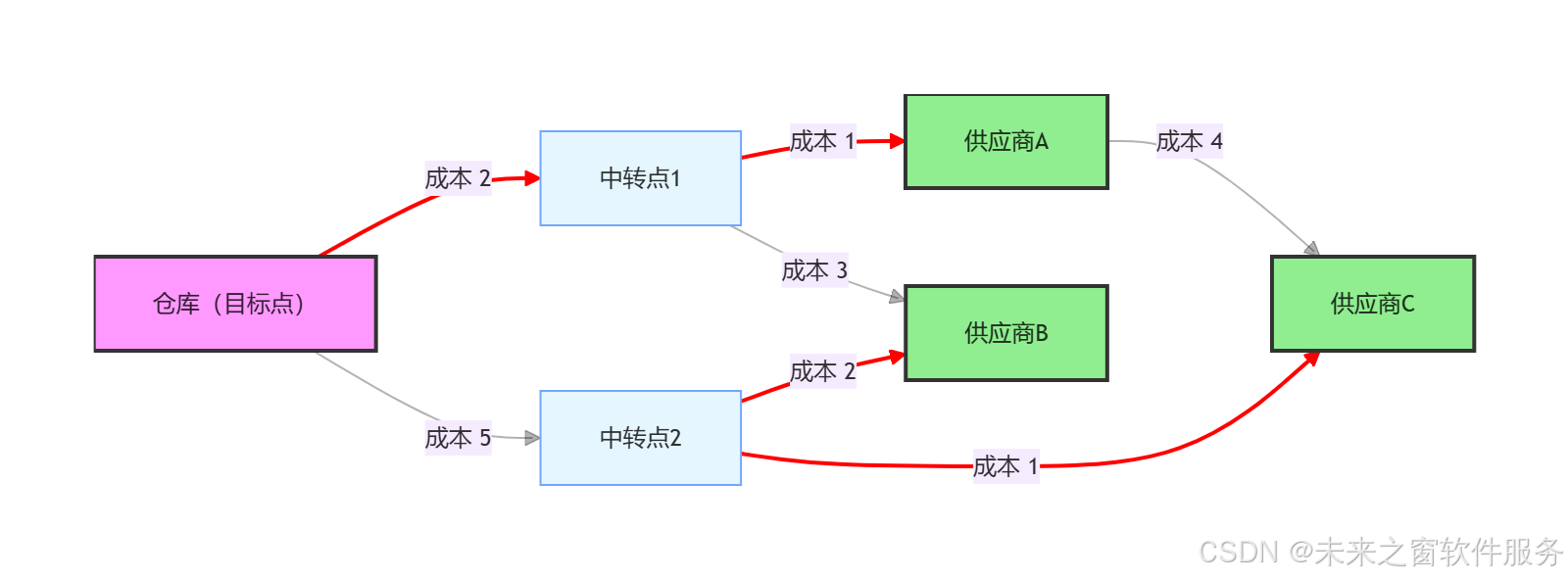 - 仓库→中转点 1→供应商 B(总成本 2+3=5,优于仓库→中转点 2→B 的 5+2=7)