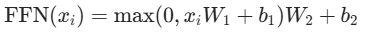 FFN的核心作用是对每个 token 的特征做精细化非线性加工,和自注意力层形成 “分工协作”:自注意力层负责捕捉 token 间的全局关联,FFN 负责强化单个 token 的特征表达能力。Transformer 的自注意力层本质是线性计算(矩阵乘法、加权求和),只能捕捉 token 间的线性关联,而真实世界的语义、逻辑关系大多是非线性的。FFN 通过 “两层全连接 + ReLU 激活” 的结构引入强非线性,公式如下: