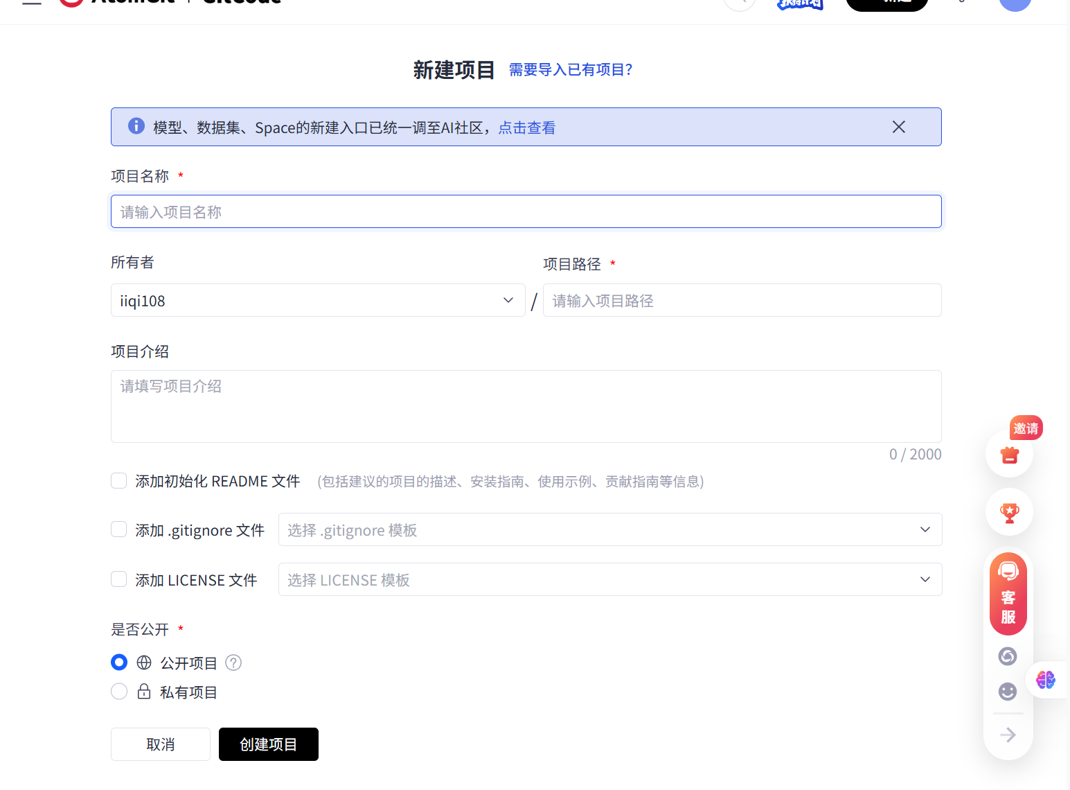 1、填写项目名称,标识符,要简洁明了且反映仓库的内容,使用英文字符。 2、路径名称自定义即可,使用英文字符。 3、 仓库介绍,可选,可以详细说明仓库中代码或者项目的用途等相关信息。 4、初始化选项