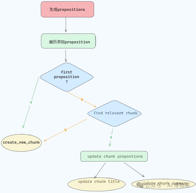 实现Agentic Chunking的关键在于propositioning和文本块的动态创建与更新。我们可以使用Langchain和Pydantic等工具来实现这一过程。流程图如下: