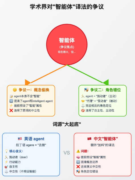 但学术界其实在吐槽,说这是偷换概念,agent本不含"智能"意思,我们硬塞进去,混淆了agent和intelligent agent。而且角色错位,agent是"施动者",中文"代理"却是"受动者",和AI的自主性相反。还有学科打架,"主体"在哲学法学都有固定含义,拿来译agent容易混乱。