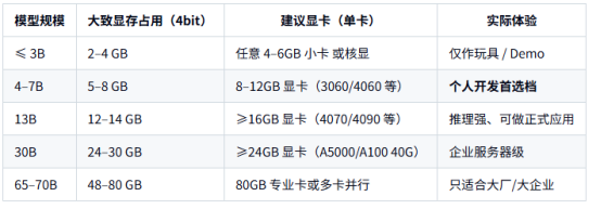7B 4bit + 8–12GB 显卡 是最合理起点;