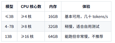 只能勉强跑 ≤7B 的 4bit 量化模型,且 速度会明显比 GPU 慢 5–20 倍。