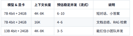 大致并发能力(以 24GB 显卡 + vLLM 为例):
