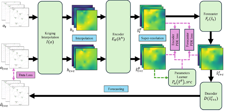 方法:PIPO利用不准确的PDE信息和部分观测数据,同时实现超分辨率重建和未来状态预测。PIPO框架包含五个主要模块:插值器(Interpolator)、编码器(Encoder)、预测器(Forecaster)、解码器(Decoder)和参数学习器(Parameters Learner)。这些模块通过data loss和PDE loss联合优化,实现从部分观测到高分辨率重建和未来预测的全流程建模。