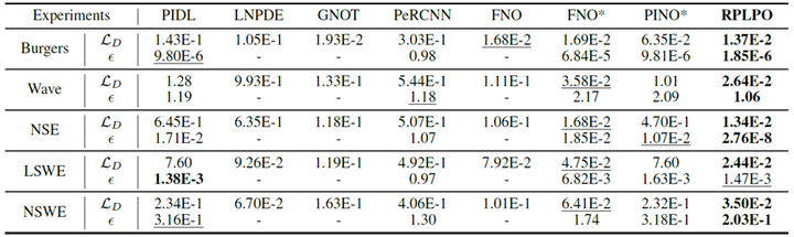 为了验证RPLPO框架的有效性,我们在多个物理系统上进行了实验,包括Burgers方程、波动方程、Navier-Stokes方程、线性浅水方程和非线性浅水方程。这些实验涵盖了单步预测和多步预测,结果表明RPLPO在泛化能力上显著优于现有的基线方法。