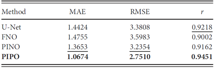 PIPO不仅能够重建当前状态,还能预测未来多个时间步的状态,且预测精度优于现有方法。例如,在表5中,PIPO在均方误差(MAE)、均方根误差(RMSE)和相关系数(r)三个评估指标上均优于所有基线方法。具体来说,PIPO相比最强的基线方法(PINO)在MAE、RMSE和相关系数(r)上分别降低了21.8%、15%和提高了3.2%。