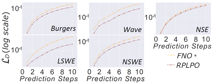 多步预测:图2展示了RPLPO与FNO*(基线方法中表现最好的)在所有基准测试中的多步预测结果。RPLPO在所有预测步数上均显著优于FNO*,随着预测步数的增加,性能差距逐渐增大。例如,在Navier-Stokes方程中,RPLPO在第10步预测时的误差比FNO*低约70%。这表明RPLPO能够更好地维持长期预测的精度。
