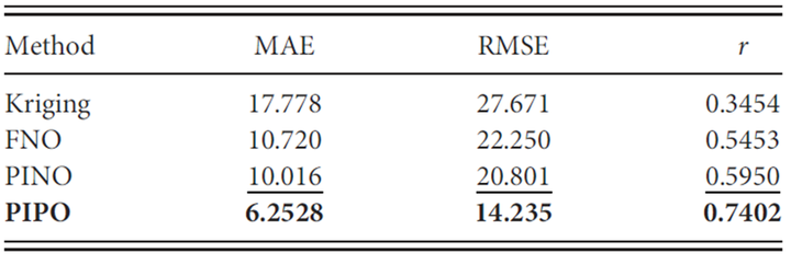 PIPO能够从稀疏的部分观测中准确重建高分辨率的浓度场,相比传统方法(如Kriging插值、U-Net等)显著提高了重建精度。例如,在表4中,PIPO在均方误差(MAE)、均方根误差(RMSE)和相关系数(r)三个评估指标上均优于所有基线方法。具体来说,PIPO相比最强的基线方法(PINO)在MAE、RMSE和相关系数(r)上分别提高了37.5%、31.5%和24.4%。当与传统的Kriging插值方法相比时,PIPO的性能提升更为显著,分别在三个指标上提高了81.5%、81.7%和270.6%。