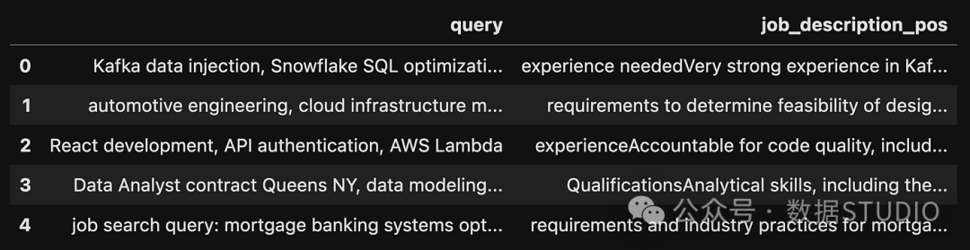 接下来为每个示例挑选出负样本对。我使用预先训练的embedding模型来计算数据集中所有已清理的JD之间的相似度。然后,对于每个正样本对,我挑选出与负样本最不相似的JD(同时确保没有两行包含相同的负样本)。
