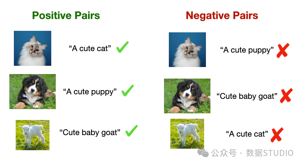 这包括学习最大化正对之间相似度并最小化负对之间相似度的表示。在图像-文本模型中,正对可能是带有合适标题的图像,而负对可能是带有不相关标题的图像(如下所示)。