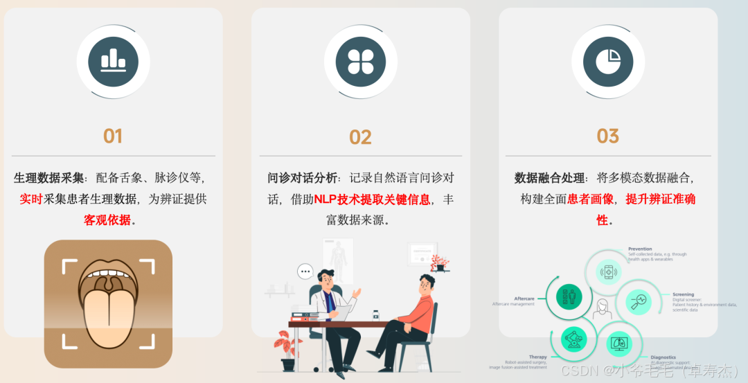 - 数据融合处理 将多模态数据融合,构建全面患者画像,提升辨证准确性。