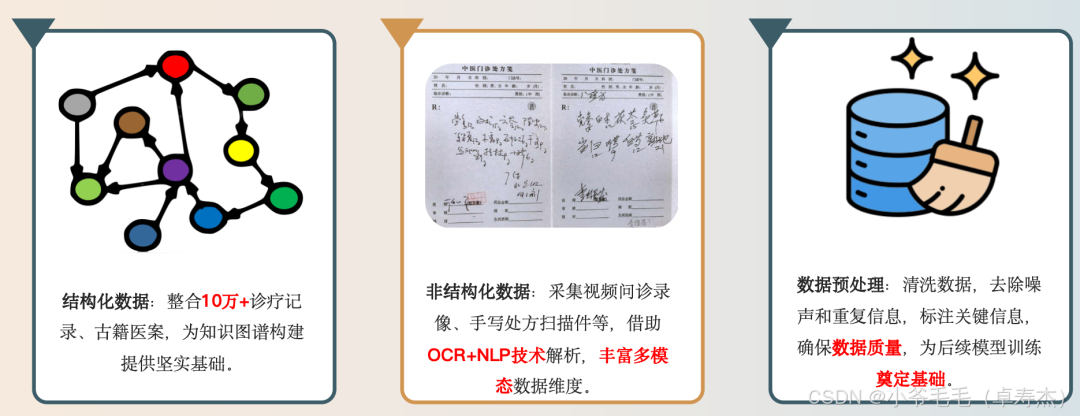 - 结构化数据 整合10万+诊疗记录、古籍医案,为知识图谱构建提供坚实基础。