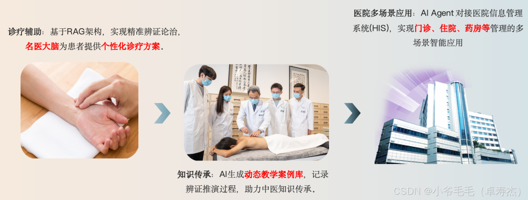 - 诊疗辅助 基于RAG架构,实现精准辨证论治,名医大脑为患者提供个性化诊疗方案。