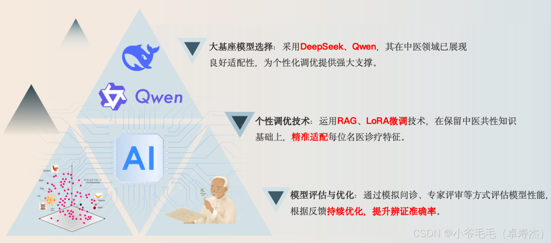 - 大基座模型选择 采用DeepSeek、Qwen,其在中医领域已展现良好适配性,为个性化调优提供强大支撑。