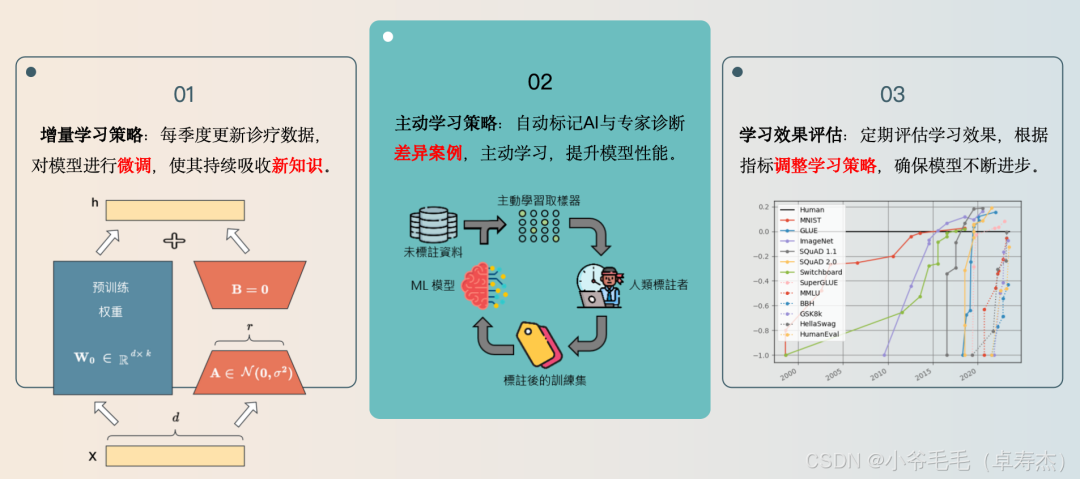 - 增量学习策略 每季度更新诊疗数据,对模型进行微调,使其持续吸收新知识。