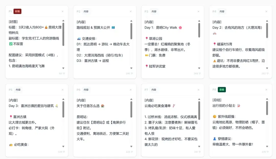 •第一步:输入主题,也可以根据需要上传参考图。 说白了,你只需要给它一个方向,比如“昆明大理 5 天攻略”或者“职场穿搭”。