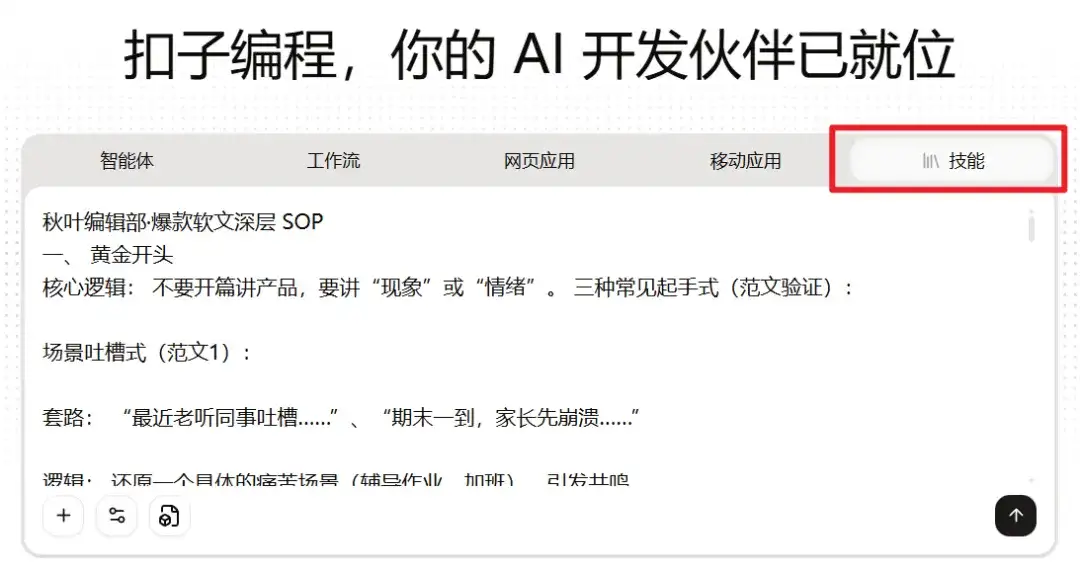 如果说红鸦 AI 是图文领域的尖兵,那扣子(Coze)的 Skill 功能就是办公领域的“预制菜”。 以前用 AI 写文章像是在“现杀现做”,你得自己切菜调味。现在有了 Skill,你可以把你的写作经验、参考范文、特定语气全部封装进去。