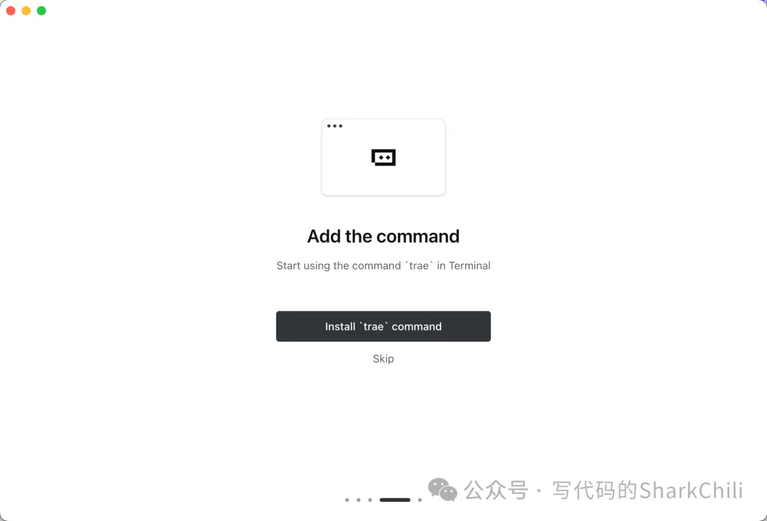 和vscode类似,Trae同样支持通过命令行唤起,如下初始化界面提示,选择install Trae Command,后续我们就可以通过命令终端输入trae 打开Trae IDE: