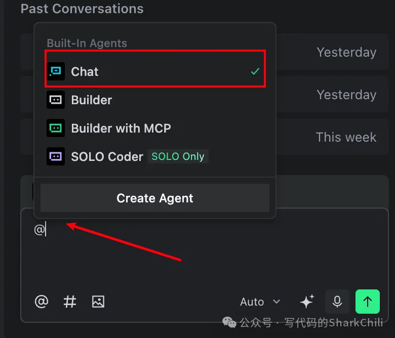 明确思路后我们就开始本次的编码工作,我们首先通过@选项将模式切换为chat模式: