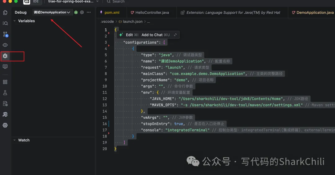 这里笔者也给出自己的配置模板,如下所示,关于配置的基本含义笔者都在配置项右边加以注释表名,这里笔者特别说明一下stopOnEntry这个选项,笔者在这里设置为true是为了调测Trae调试是否生效,若生效则项目启动后会在入口main方法中停止,等待用户步进: