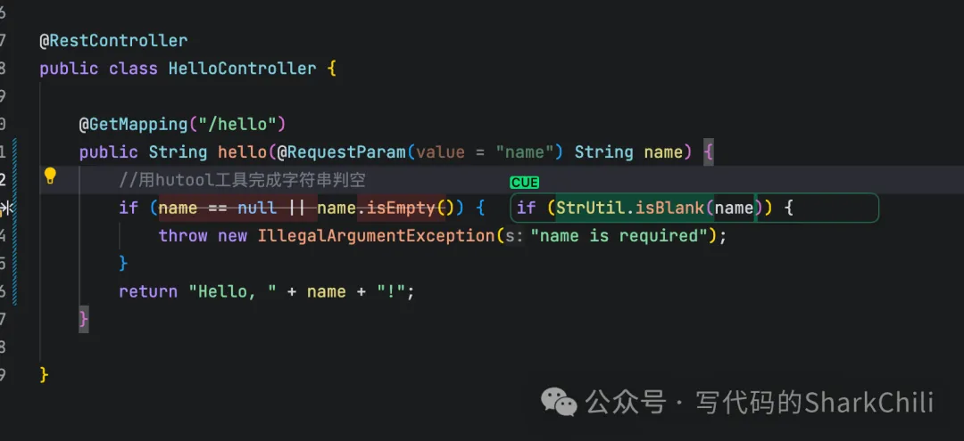 同时cue模式也是支持通过感知上下文,完成代码修改和补全,例如笔者希望将字符串判空操作用hutool工具类,也直接通过声明注释的方式驱动cue模式感知和修改: