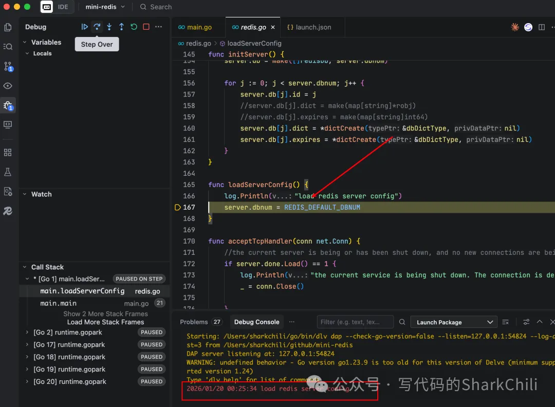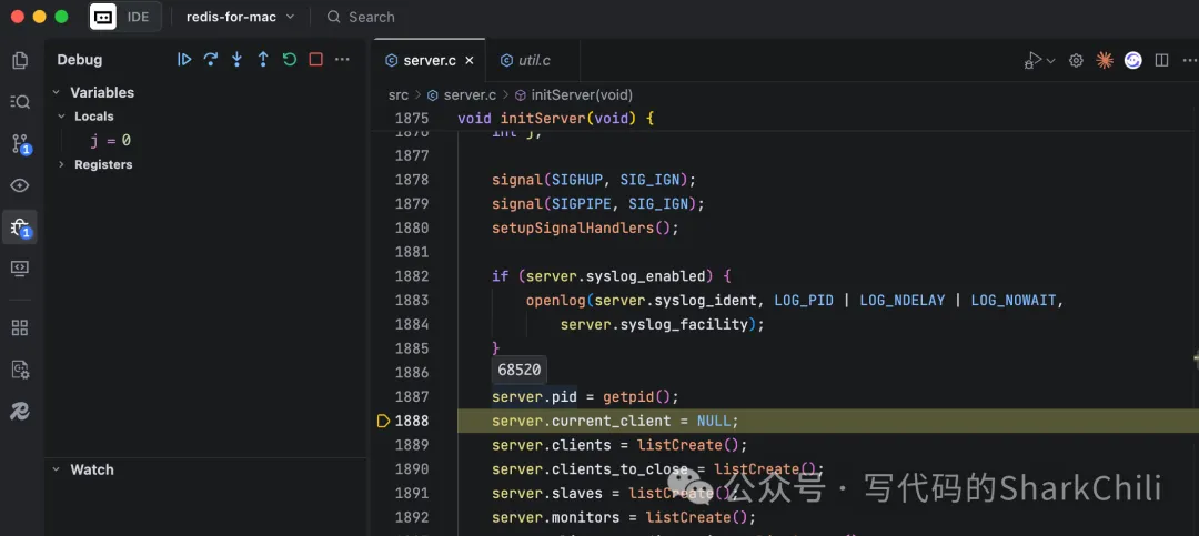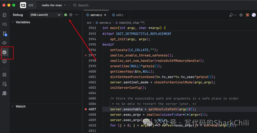 接下来就是存量环境配置的验收,因为笔者之前一直通过vscode调测理解redis源码,按照Trae的提示,正常情况下Trae也是可以正常跑通并运行redis源码。 和vscode操作基本类似,完成项目导入后,直接点击debug选择开始调试: