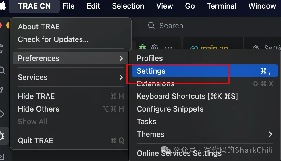 对应笔者也给出Trae进入设置选项的操作界面,读者也可以根据settings选项右边的提示快捷进入,以笔者的mac笔记本为例就是Command+,