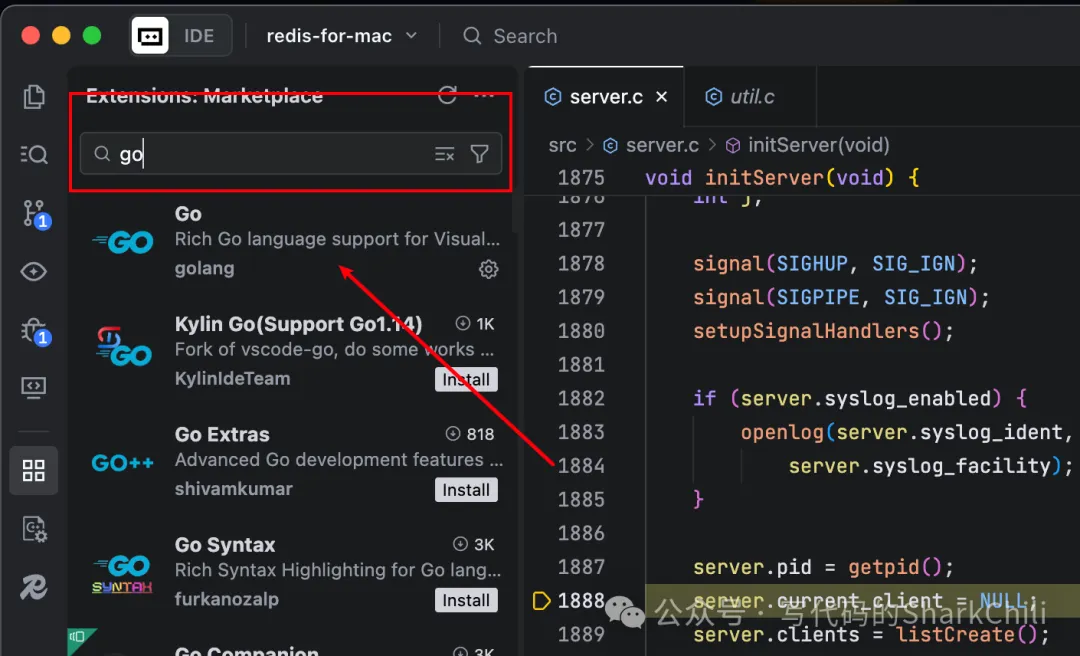 以笔者一直维护的一个开源学习项目mini-redis为例,该项目采用go语言编写,对应我们也需要在Trae中集成go语言相关插件,和vs code操作步骤类似,在插件市场搜索go,找到排在最前面的插件点击安装,等待片刻后我们就完成了Trae IDE下go语言环境的基本搭建了: