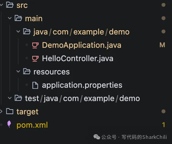 通过上述的配置步骤我们的Trae已经具备运行spring boot程序的基本要求了,这里笔者通过提示词的方式基于Trae的builder模式快速生成一个spring boot的基础程序,对应项目结构如下图所示: